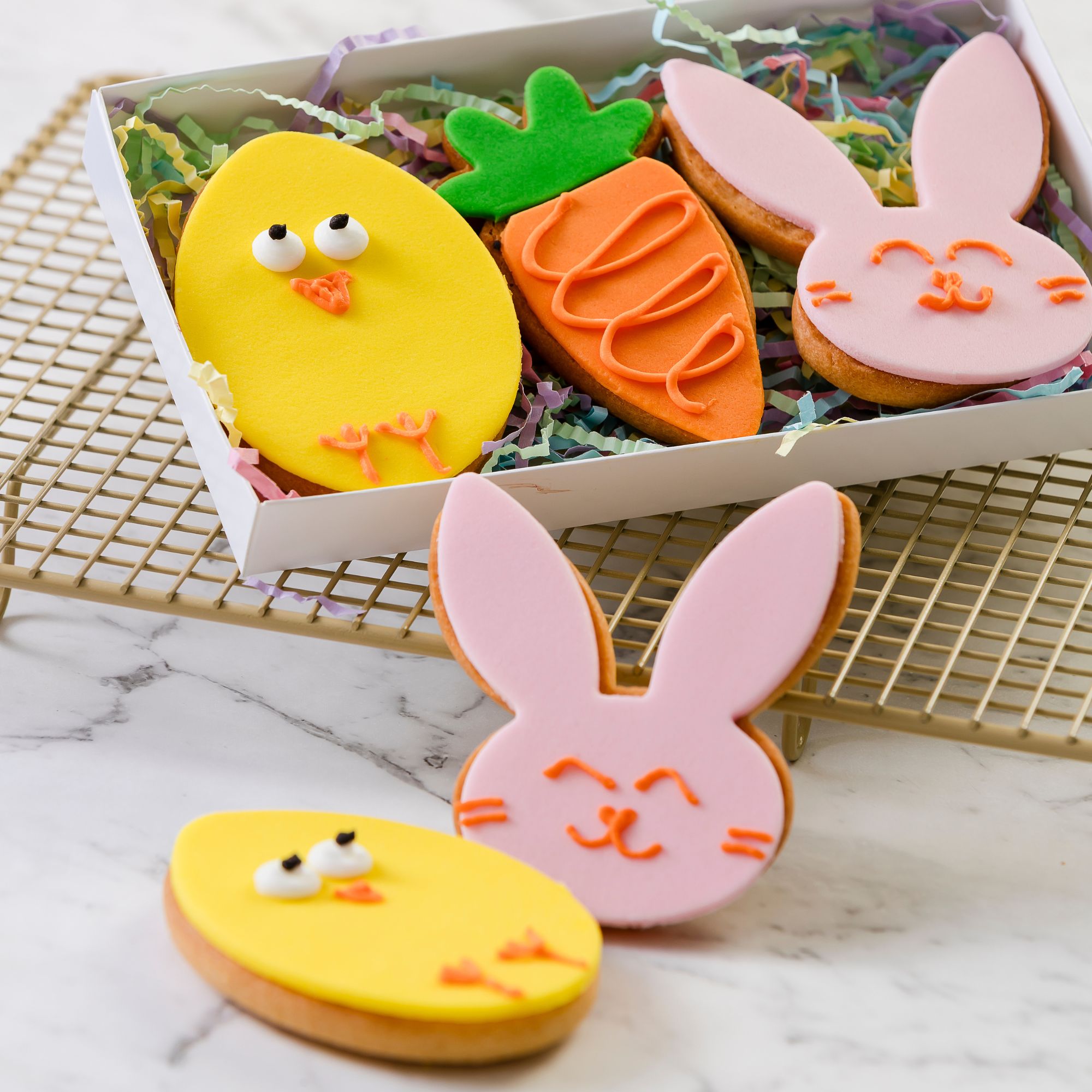 Bright, playful and made to share, these biscuits are a limited-time Easter favourite. Each Easter Biscuit starts with a traditional vanilla biscuit base, topped with smooth, colourful fondant and finished with one of three cheerful designs.