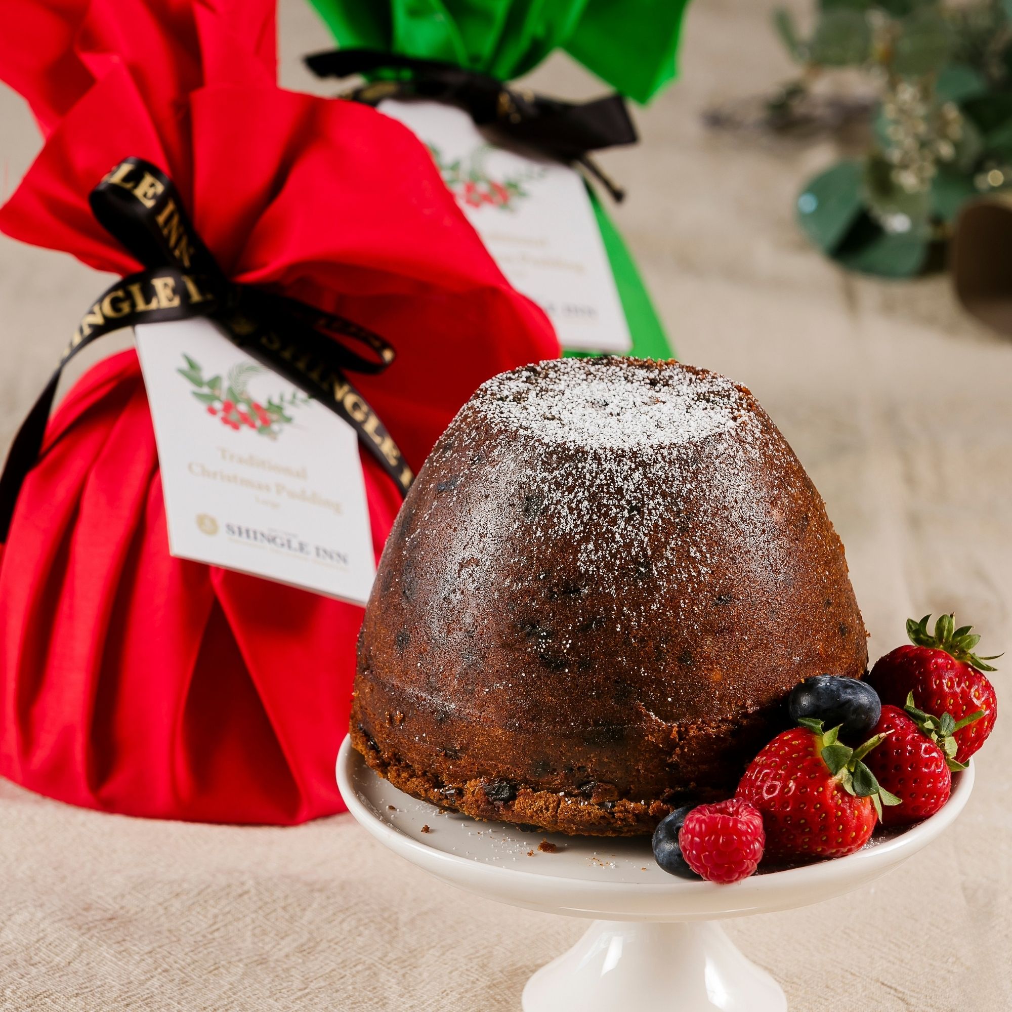 Just as we did then, we continue to hand-make and steam our puddings in-house, ensuring they’re ready to make your Christmas effortless and unforgettable. Each pudding is wrapped in festive red or green cloth and finished with Shingle Inn ribbon, making it an elegant gift or a stunning addition to your festive table.